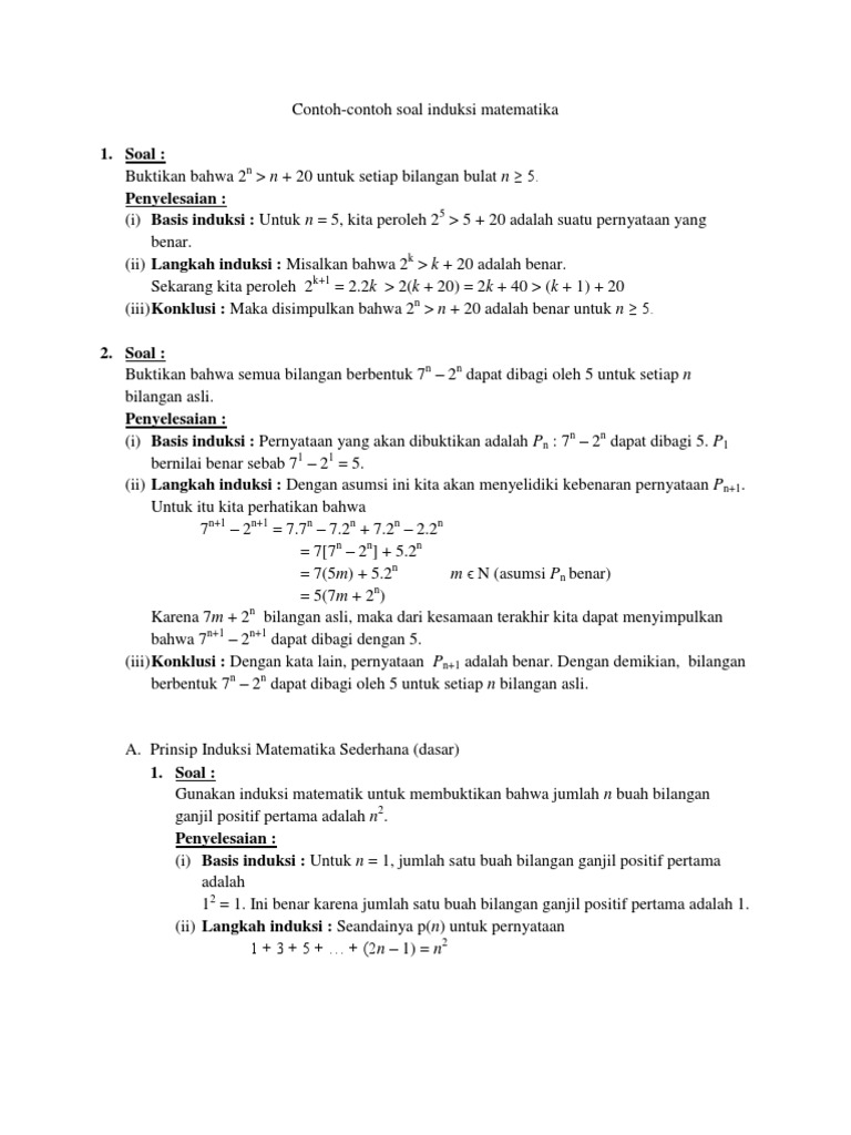 Induksi matematika merupakan sebuah metode deduktif yang digunakan sebagai pembuktian pernyataan benar atau salah. Persamaan tersebut dianggap memiliki satu variabel, yaitu :x. Contoh Soal: Tentukah penyelesaian dari sistem persamaan linear dua variabel berikut Mengeliminasi variabel dapat dilakukan dengan mengurangi persamaan I dengan persamaan II.